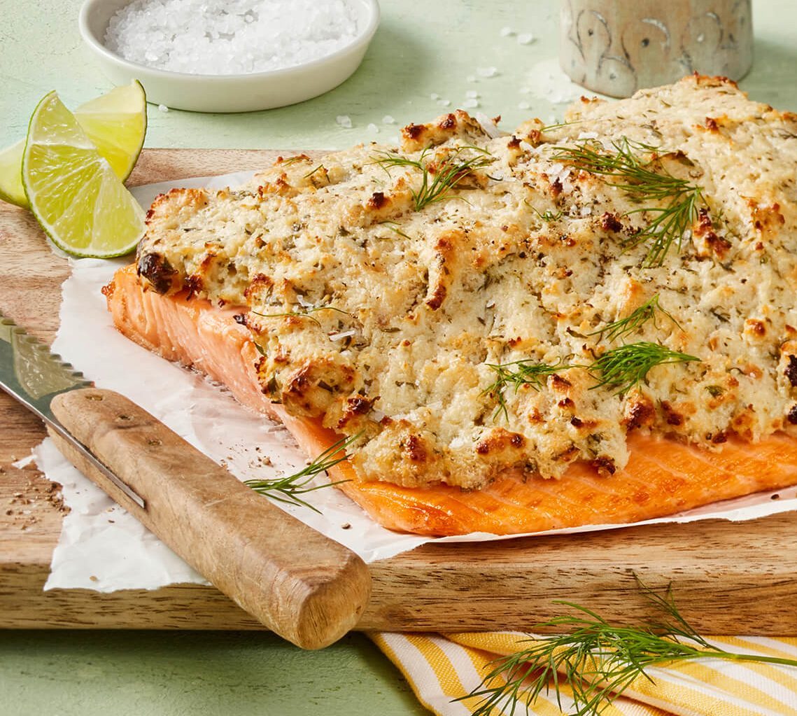 - Lachsfilet trocken tupfen und auf ein mit Backpapier ausgelegtes Backblech legen. Lachsfilet mit der Frischkäsemasse bestreichen. Unter dem vorgeheizten Backofengrill bei 180 °C (oder auf dem heißen Grill bei indirekter Hitze) ca. 15 Minuten garen. Lachsfilet aus dem Ofen nehmen und anrichten. Mit übrigem Dill garnieren.